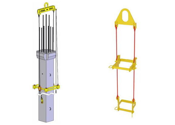При возведении железобетонных колонн часто применяют траверсу для установки колонн (специальное оборудование для подъема колонн). Существует два основных способа крепления траверсы к колонне: через верхнее технологическое отверстие и через нижнее. Траверса для установки колонн через верхнее отверстие обычно состоит из трех основных компонентов: самой траверсы с крюками, цепей (стропов) и штыря в сборе.